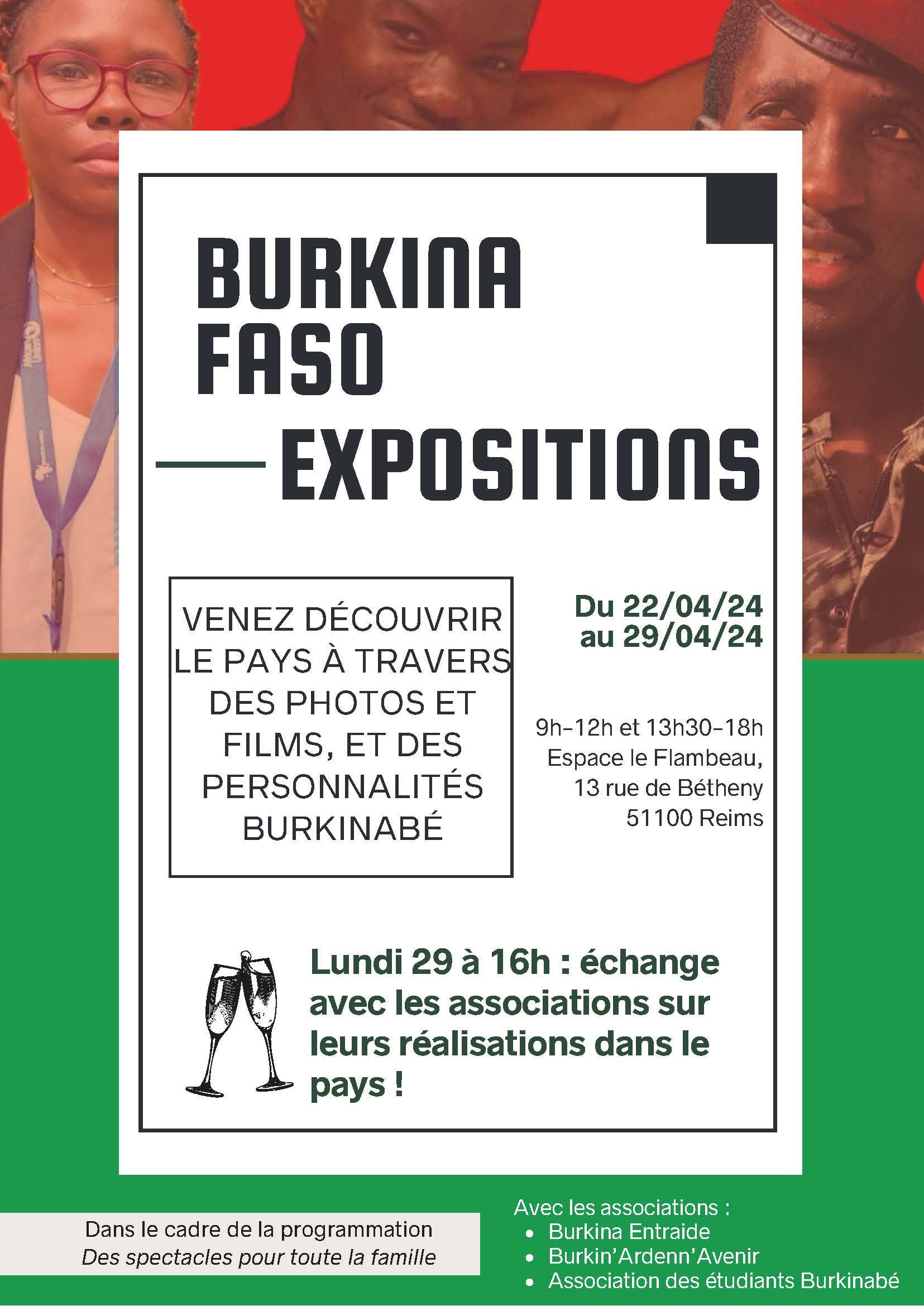 Le pôle Culture des Maisons de quartier de Reims organise deux expositions aux côtés de 3 associations qui agissent pour les populations burkinabés à la Maison de quartier Le Flambeau du lundi 22 avril au lundi 29 inclus. Elles porteront sur des photos et films des voyages et réalisation des associations dans le pays, puis la seconde sur d’inspirantes personnalités Burkinabé. L’objectif de ces expositions est de dépasser les préjugés sur le pays en permettant aux habitants de le découvrir autrement, tout en ayant une première approche de la solidarité internationale.
