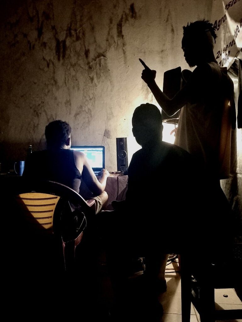 J'étais tranquillement avec Rosine, mon amie de Kinkala, installée au Divin, un bar où elle travaillait. Ce bar est situé juste à côté du « musé », un des lieux culturels de la ville où il y a régulièrement des concerts et des évènements en tout genre. Il y a également un studio d'enregistrement où des artistes locaux peuvent venir enregistrer leurs musiques. Et ce jour-là justement, Bémi, une des personnes avec qui je pars régulièrement sur le terrain pour faire des reportages sur les porteurs de projet, était en train d'enregistrer son nouveau tube. On le voit et on va discuter 5 minutes pour le saluer et il nous invite à venir voir comment se passe un enregistrement, si on était intéressées. Par curiosité, on rentre dans le studio et on s'installe dans un coin discrètement. L'enregistrement était presque terminé mais il faut savoir que dans les chansons Congolaises, il y a une toute partie du morceau qui est destinée à faire des dédicaces à rallonge à tous les gens qui ont participé de près ou de loin à la réalisation de la musique en question. Et c'est donc comme ça que l'on peut maintenant entendre « Morgaaaaaane, une lumièèèèèère… » dans une chanson qui passe régulièrement sur la radio locale de Kinkala… (Bien-sûr, Rosine aussi a eu le droit à sa petite dédicace !)
