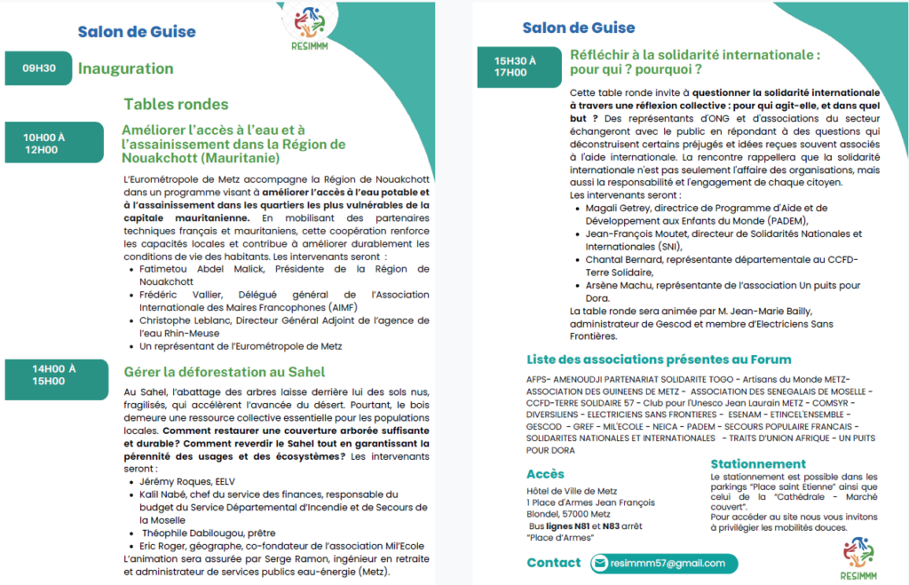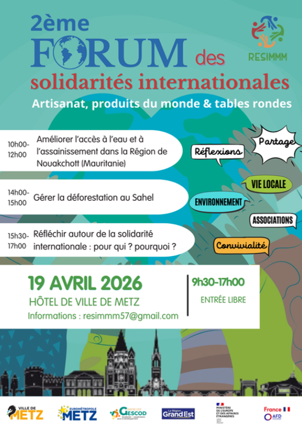 Le RESIMMM, la Ville de Metz, l'Eurométropole et Gescod organisent la 2ᵉ édition du Forum des Solidarités Internationales, un rendez‑vous gratuit et ouvert à tous pour découvrir les initiatives locales et internationales en faveur d'un monde plus solidaire.