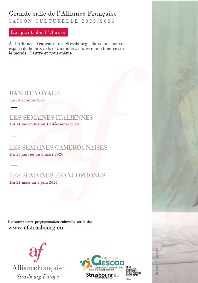 Dans le cadre de la coopération Strasbourg-Daoula, en partenariat avec GESCOD et avec le soutien de la Ville de Strasbourg, l’Alliance Française Strasbourg Europe vous invite aux Semaines camerounaises du 14 janvier au 6 mars 2026. Ce cycle de rencontres artistiques et culturelles met à l’honneur le dialogue entre la France et le Cameroun à travers des événements variés. Le vernissage inaugural aura lieu le 14 janvier à 19h, l’inscription est encore possible sur le site de l’Alliance Française.