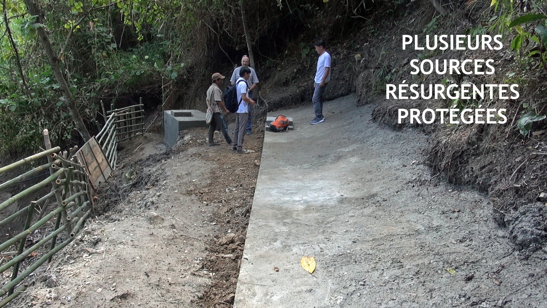 Réseau gravitaire et captage de sources résurgentes : Les villageois ont travaillé sous la direction du technicien de CONFLUENCE et de 2 chefs maçons. De nouvelles sources ont été captées 60 mètres au dessus de l’ancienne zone de captage. Kiou Chalouang a acheté le terrain au village voisin pour 2 millions de kips (200 €uros) Ces nouvelles sources ont été couvertes par une dalle en béton (12 m x 3m) afin de préserver la qualité naturelle de l'eau de source et tout usage nuisible. Le débit est d’un litre toutes les six secondes, soit 600 L/h et 14 400 L/jour. Un bassin de mise en charge permet d’assurer que le nouveau réseau d’eau ait un débit maximum et constant. Un réseau de 4 km de tuyaux en polypropylène de 50 mm de diamètre, enterrés à 70 cm, fait la jonction entre le bassin de mise en charge de la zone de captage avec le nouveau réservoir de 24 M3 construit au niveau de l'école située sur le haut du village. Cet ouvrage permet d’alimenter sept bornes-fontaines qui assurent un accès à l'eau sécurisé et de proximité aux villageois.